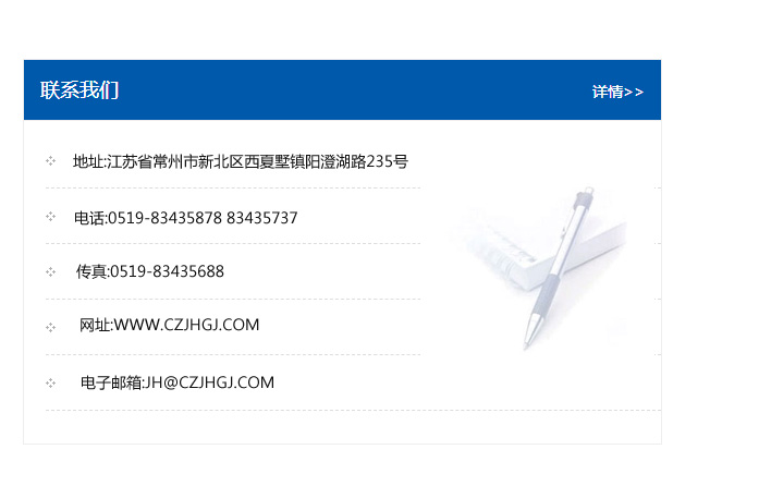 地址:常州市新北區友邦商務大廈1幢16、17層  電話:0519-85101652  傳真:0519-85112595  郵編:213022  網址:www_cz-jiayue_cn.tzlehua.com  郵箱:xiajifengaa@163.com